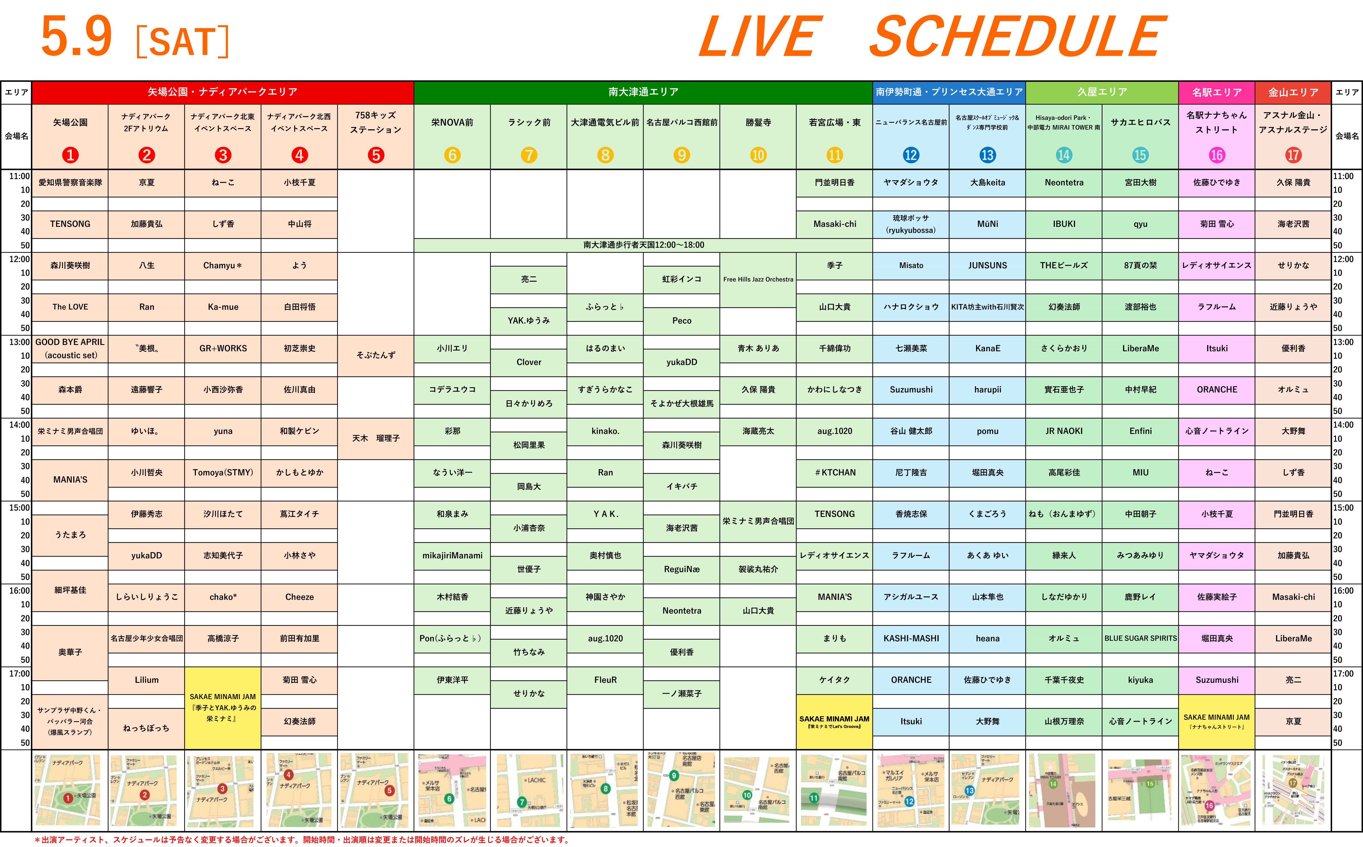 5.9 LIVE SCHEDULE 5/9【土】のスケジュールのダウンロードはこちら 5/10【日】のスケジュールはこちら AREA MAP ※出演アーティスト、スケジュールは予告なく変更する場合がございます。開始時間・出演順は変更または開始時間のズレが生じる場合がございます。