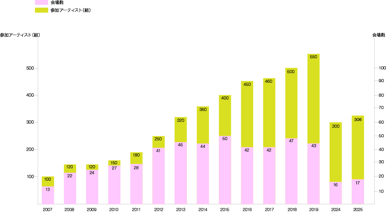 初回は2007年、名古屋栄エリアの13会場で参加アーティスト約100組の音楽イベントとして始まりました。